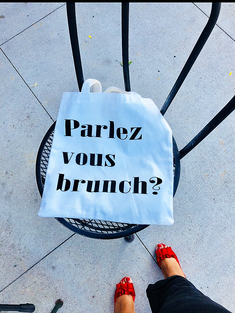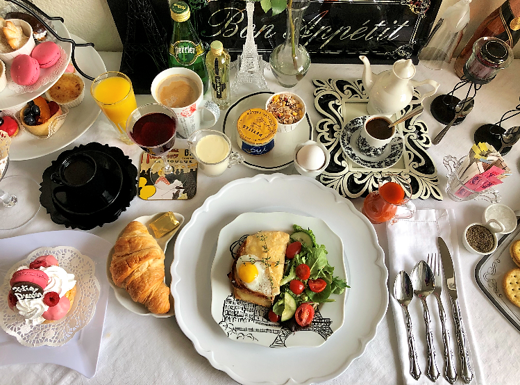 My tote bag asks, “Do you speak brunch?” and I'm here to answer Oui (Yes) fluently! Brunch cuisine this week came in duex, first at my improtu café with a yummy spinach an gruyere croissant and café au lait; but also at home, at my customary table for one. Here I have a petite croque madam topped with a quails egg, and a salad with extra French dressing on the side, of course. The highlights of this brunch however were the accessory details, such as the Moet and Chandon champagne, baked brie with fresh fruit an drizzled honey, French-styled yogurt with triple berry muesli, and decadent desserts traditional to French breakfasts.